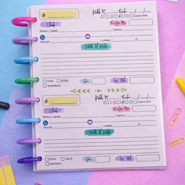 Cada hoja está diseñada con un formato práctico y funcional, pensado para anotar todos los datos importantes del pedido: información del cliente, detalles de la compra, forma de pago, envío y seguimiento.