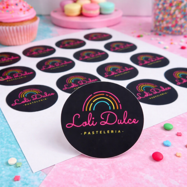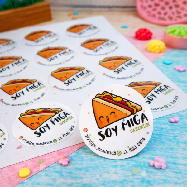 Impresión de stickers personalizados en plancha A4 (29,7 x 21 cm), ideales para packaging, ferias y marcas emprendedoras.